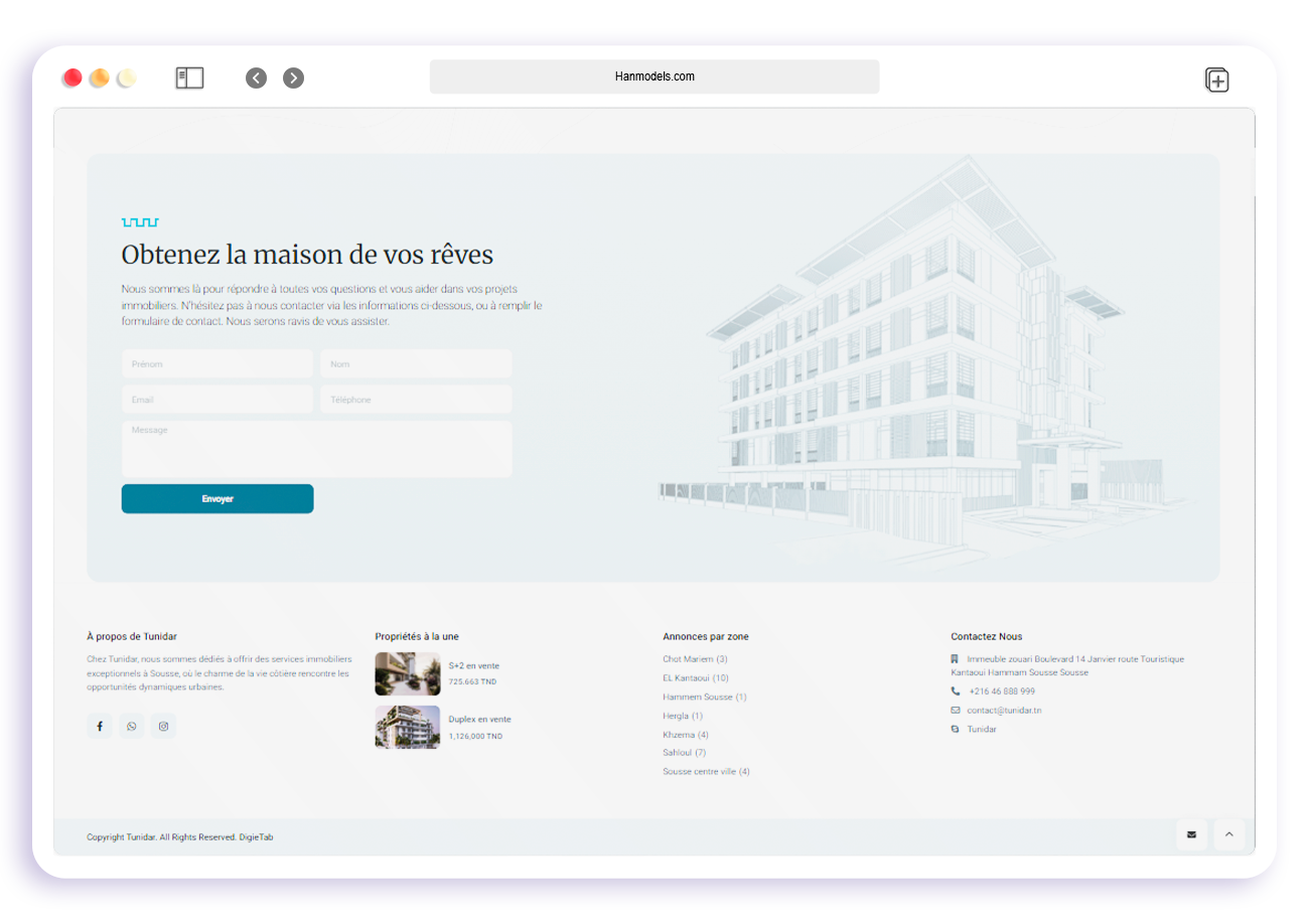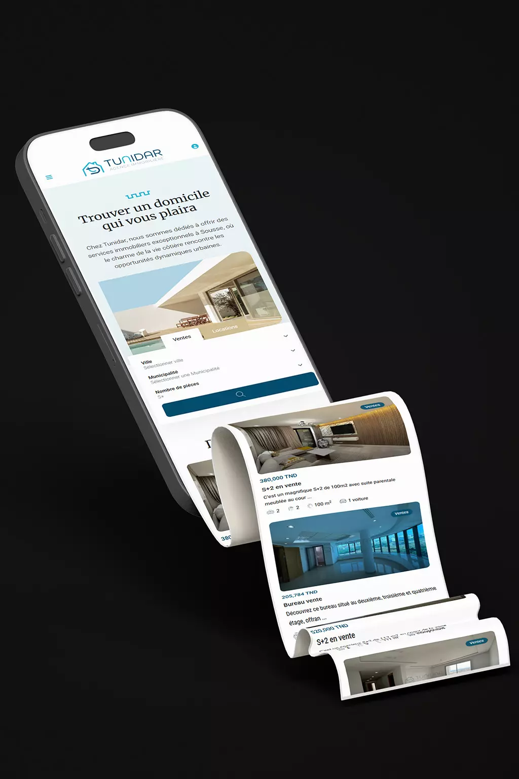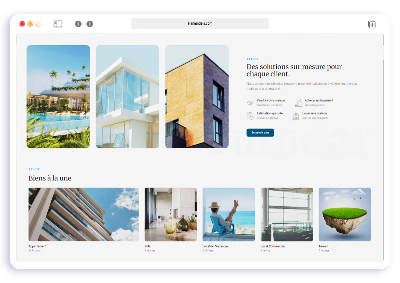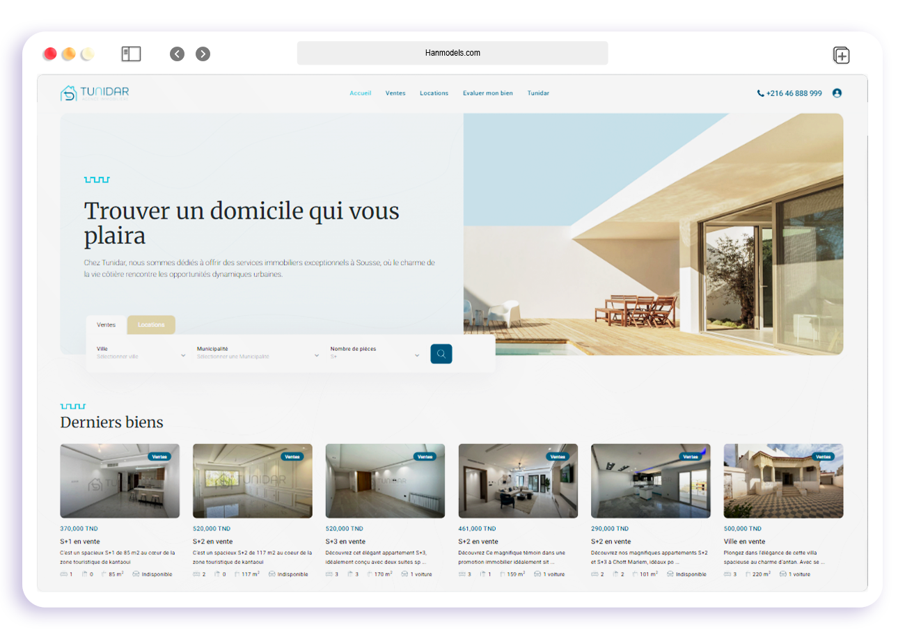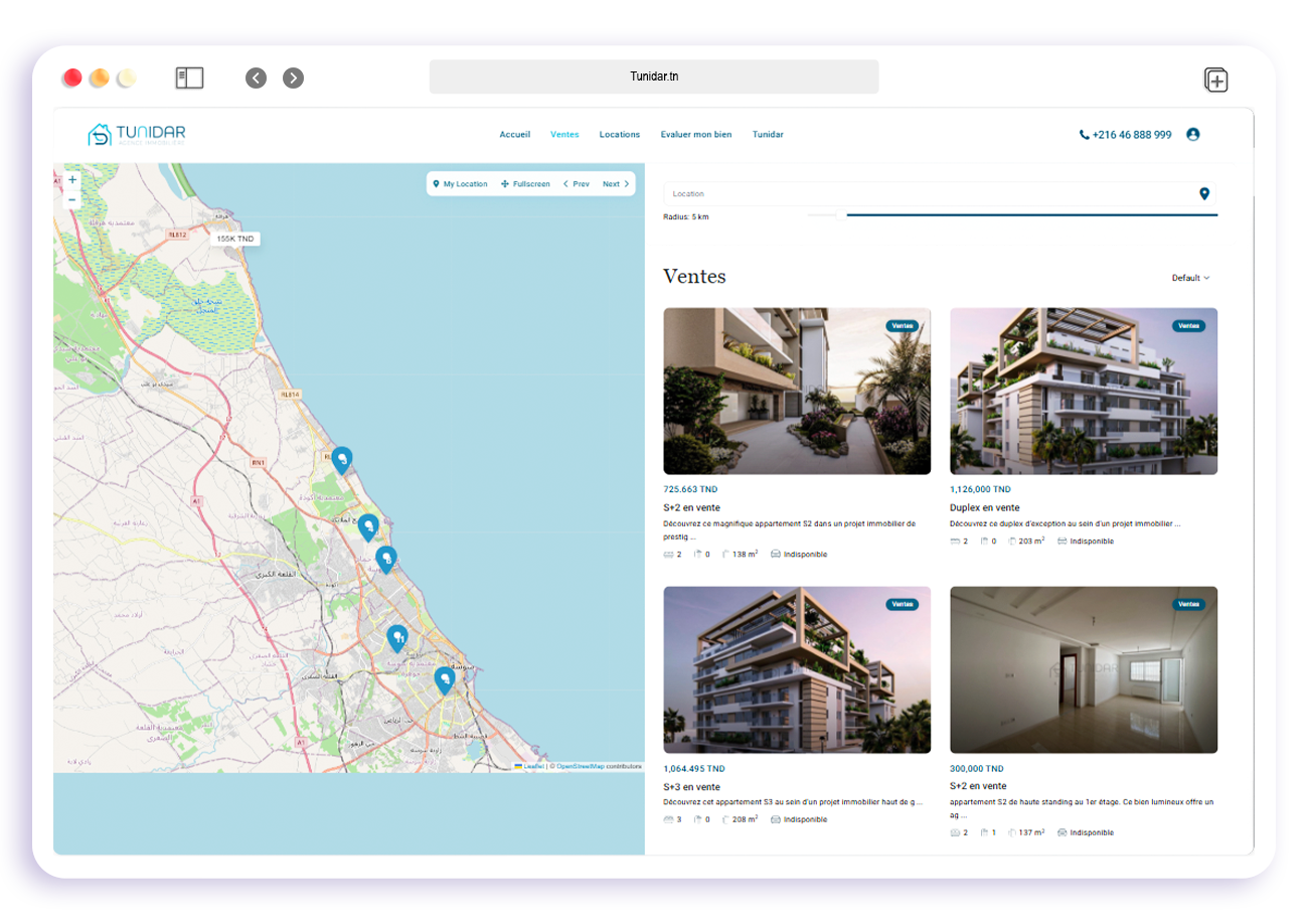As the lead front-end engineer for Tunidar, I developed a high-performance real estate platform tailored to both residential and commercial users. The site required fast search functionality, structured listings, SEO optimization, and strong mobile usability — all while maintaining a premium, trustworthy brand presence. I built the site from scratch using React, Next.js, and Tailwind CSS.